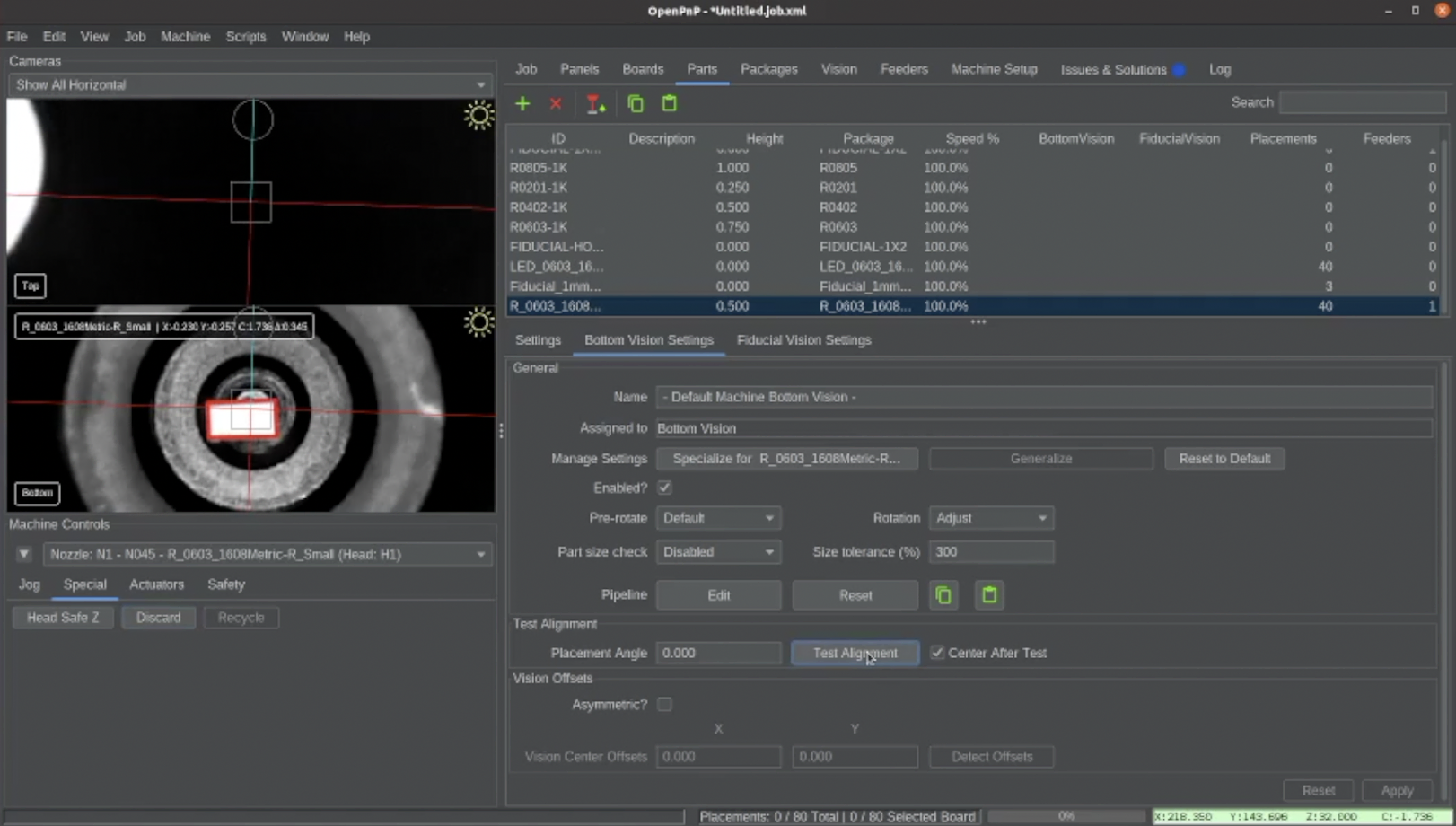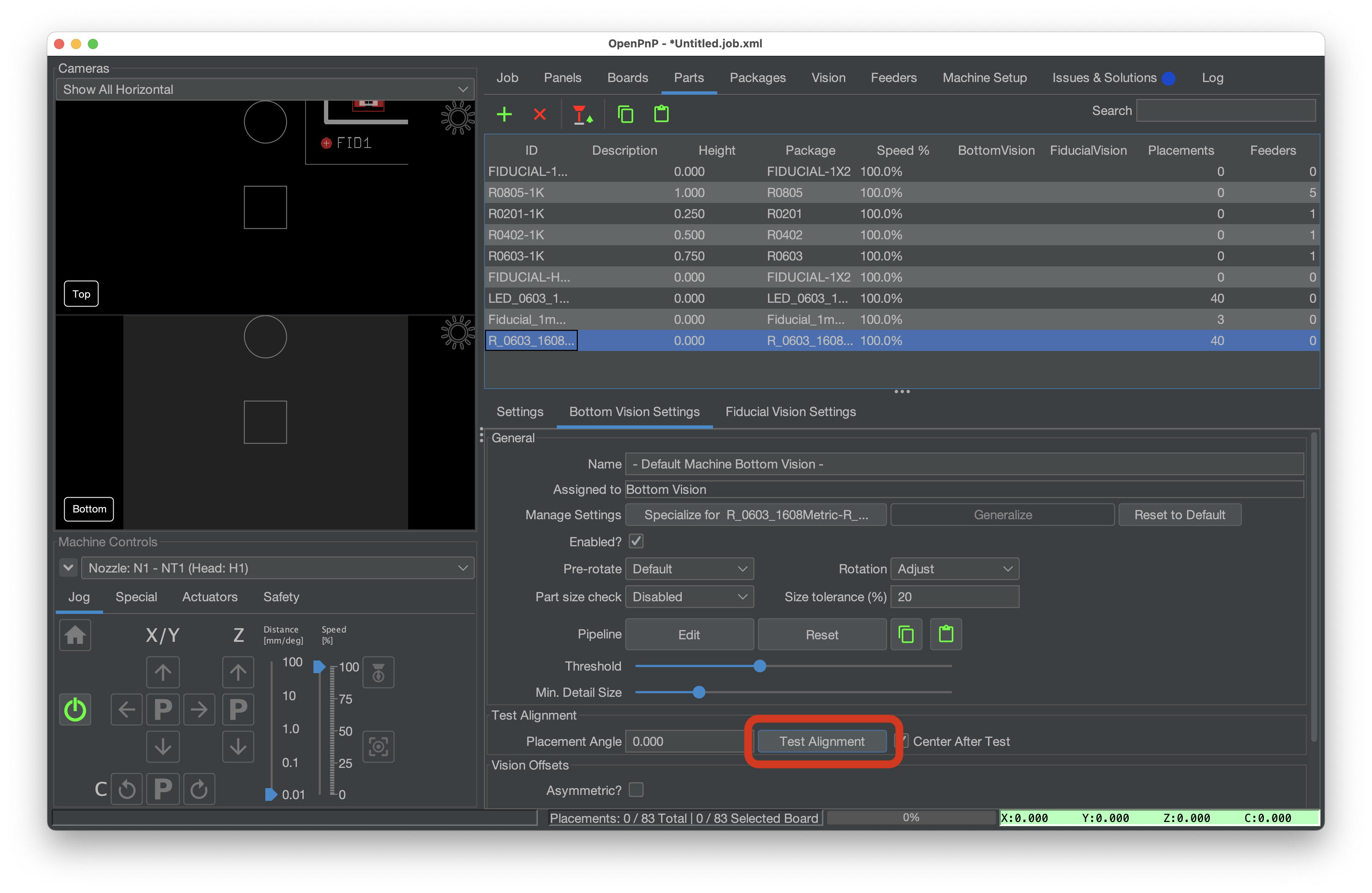 在运行任务之前,您需要测试底部视觉管线,该管线使用底部相机对准元件,以实现更精确的贴装。